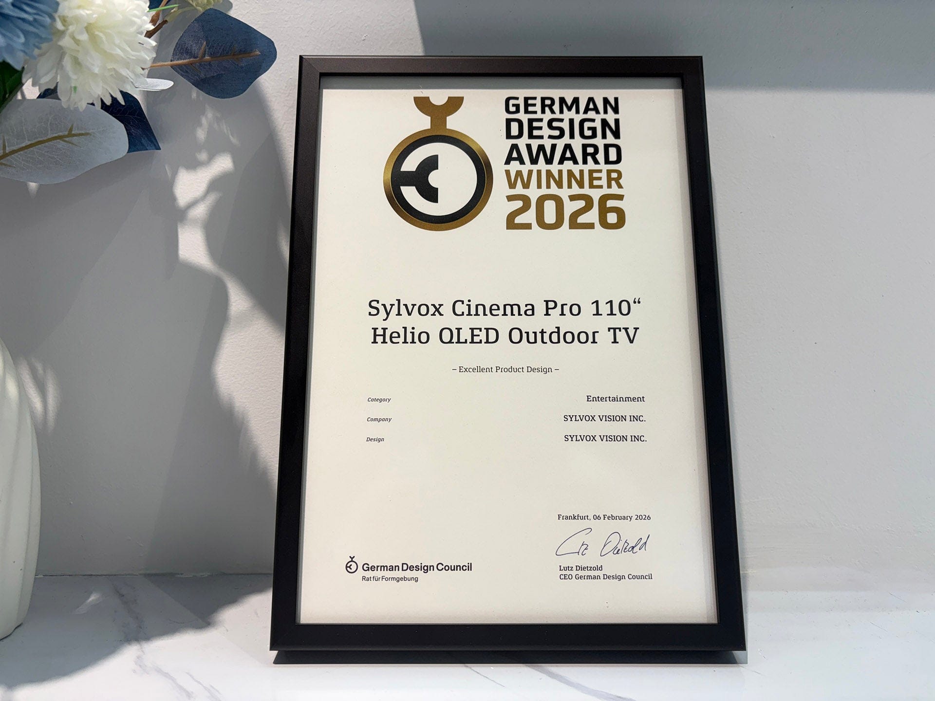 March 24, 2026 — Following its standout presence at CES 2026, Sylvox has once again gained international recognition. The Sylvox outdoor TV flagship, the Sylvox 110-inch Cinema Pro Helio QLED outdoor TV has been named a German Design Award 2026 winner, placing it among the best outdoor TVs and best full sun outdoor TVs recognized for design and innovation worldwide.