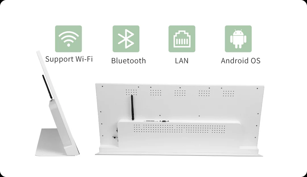 It can be connected through various methods such as WiFi, Bluetooth, and network cables to achieve more flexible and diverse display and management. For example, a desktop digital menu board device can be connected to a cloud platform through WiFi connection to achieve remote control and real-time updates; Desktop digital menu board devices can be connected to mobile phones, tablets, and other devices through Bluetooth connection, achieving rapid content transmission and updates; You can connect the desktop digital menu board device to the computer through a network cable to achieve localized management and operation.