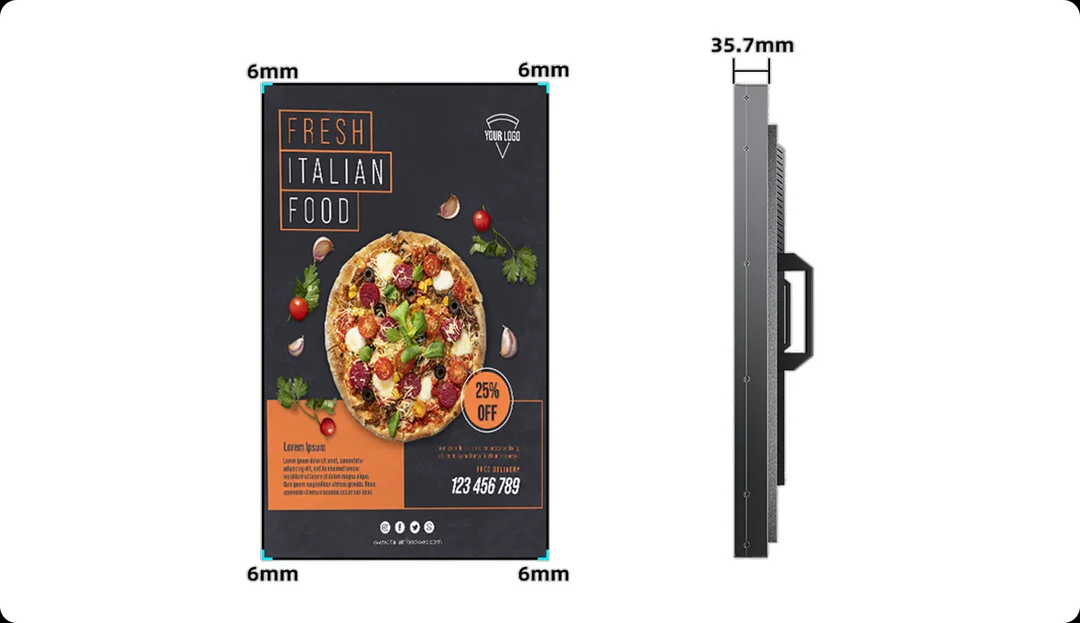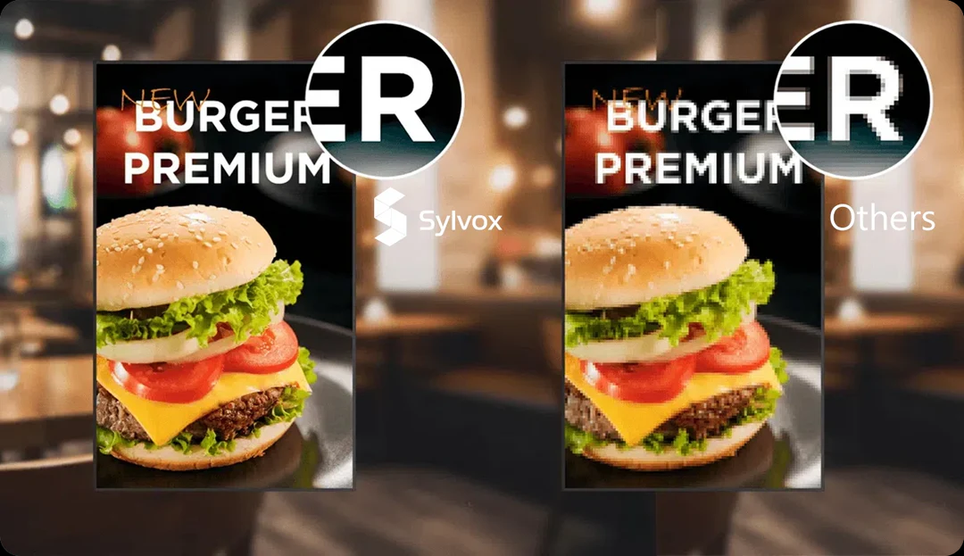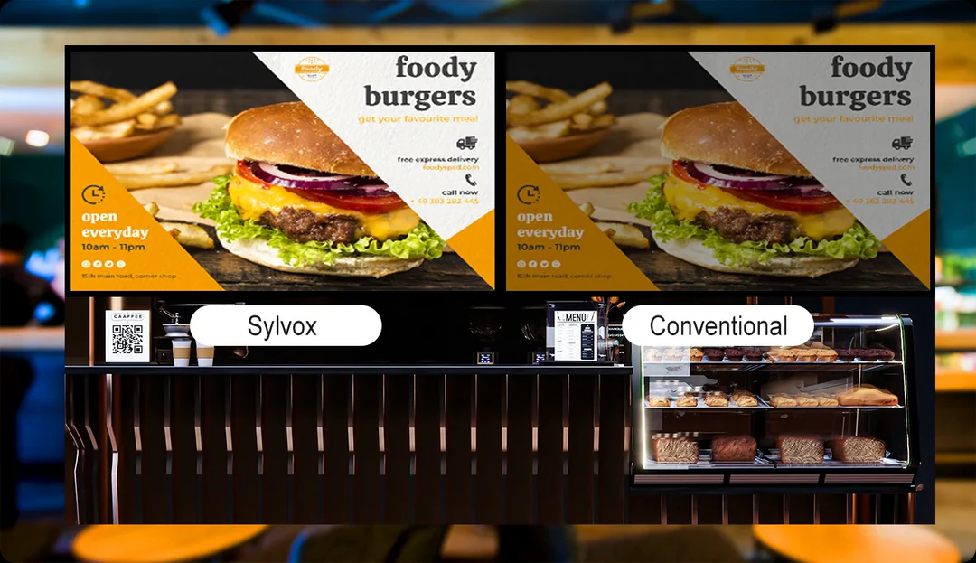 Compared to the typical brightness of 230-500 nits among peers, the brightness of the Sylvox digital menu board is nearly double that of its peers. It is designed specifically for bright spaces such as restaurants, retail stores, and shopping centers. Even in the most challenging lighting environments, it can make your content stand out.