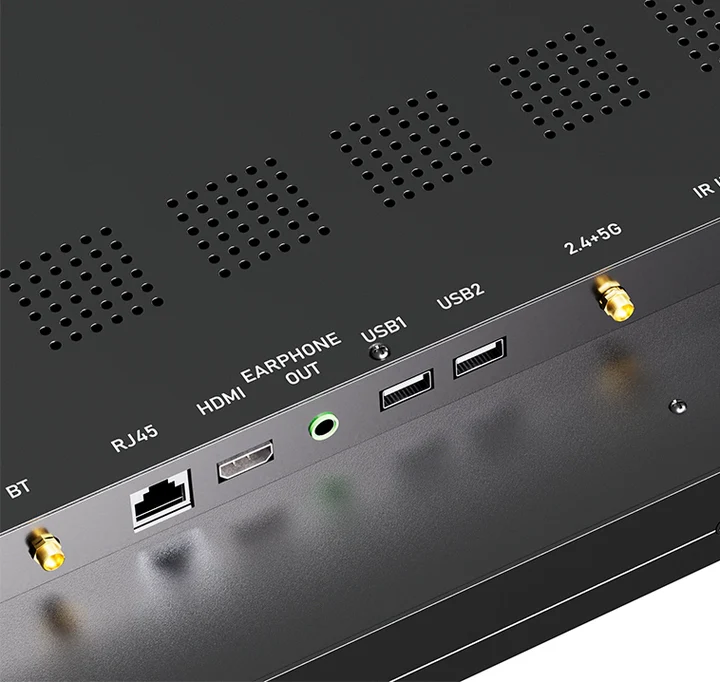 It features two USB ports, RJ54 port, HDMI input, Audio out, LAN ,WiFi and Bluetooth options, allowing you a multitude of options for accessing your visual content.