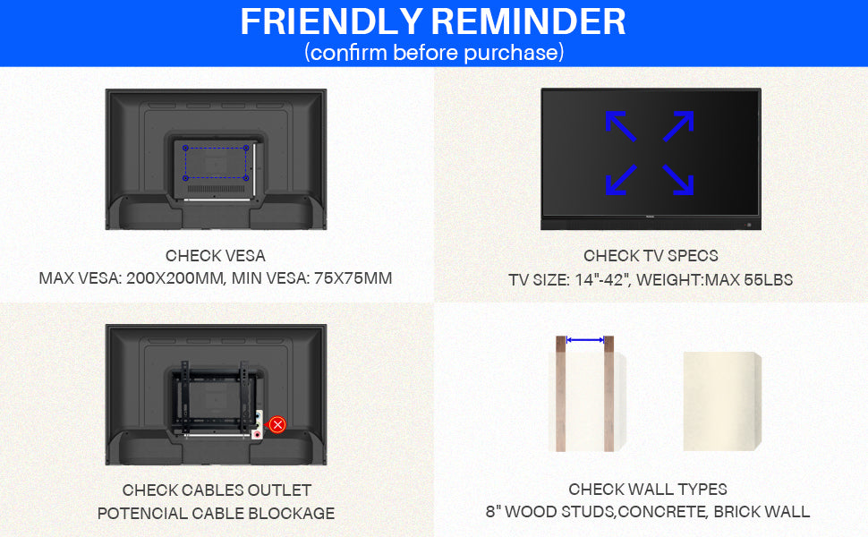 - 【Universal TV Wall Bracket】Fits most 14 - 42 inch TVs weighing up to 55lbs / 25kg. Compatible VESA holes: 200x200 / 200x100 / 100x200 / 75x75mm.